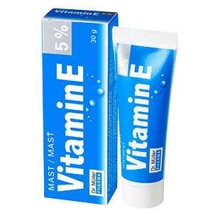 Vitamín E, alfa-tokoferol, v tukoch rozpustný vitamín, sa prirodzene vyskytuje predovšetkým v rastlinných olejoch a obilných klíčkoch. V dermatológii vitamín E pri aplikácii na pokožku podporuje jej hydratáciu, vláčnosť a hebkosť. Všetky tieto jeho účinky súvisia predovšetkým s antioxidačnou aktivitou – schopnosťou odstraňovať voľné radikály, ktoré vznikajú v dôsledku pôsobenia rôznych typov žiarenia a chemických či iných nežiaducich vplyvov životného prostredia. Pri vonkajšom použití chráni tak bunky pokožky pred poškodením, spomaľuje proces starnutia a prispieva k pružnosti, hebkosti a mladistvému vzhľadu pokožky.